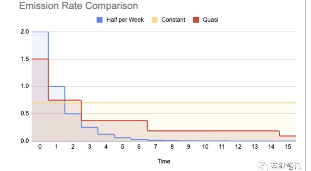 更合理的代币减产机制应该考虑系统的长期激励,一方面保证目前的流动性提供者有利可图,同时也要考虑后来的参与者有长期动力提供流动性。Equalizer的分发模型是QFS模型,它也会在每个生产周期后减半。这点跟其他项目的减产模式类似,不过它的不同点在于其生产周期的拉长。就是说,虽然每个周期其EQL代币奖励会进行减半,但生产周期会加倍,这样拉长了每次代币分配的时长,使得其代币分配本身更平滑。下面是Equalizer将其减产模型跟其他项目的减产模型进行对比的图。