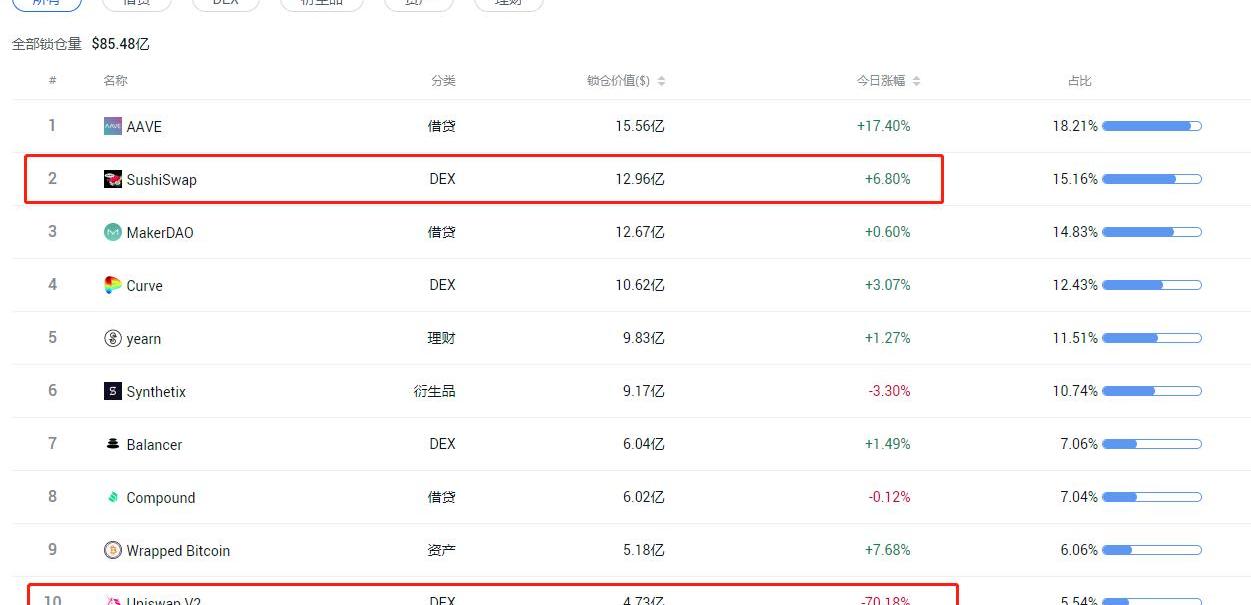 在非小号的DeFi数据页面可以看到,SushiSwap锁仓量反超了Uniswap甚至MkaerDAO,排名第2。