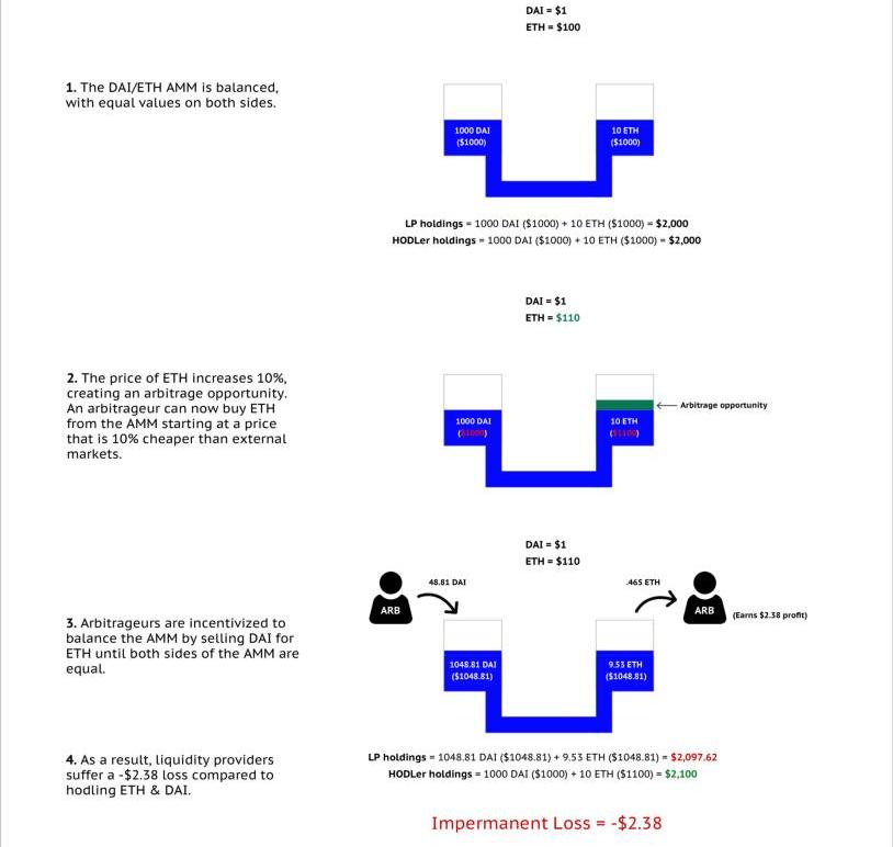 更详细地说,AMMs依靠市场参与者的不断套利来调整流动性池中的资产储备比例,使AMM的价格与外部市场价格始终保持一致。然而,套利利润是以流动性提供者的损失为代价的。只有当价格恢复到初始比率时,损失才会被抵消,这就是为什么它被定义为非永久性的。然而,因为加密资产的高波动性,非永久性的损失有时会变为永久损失。