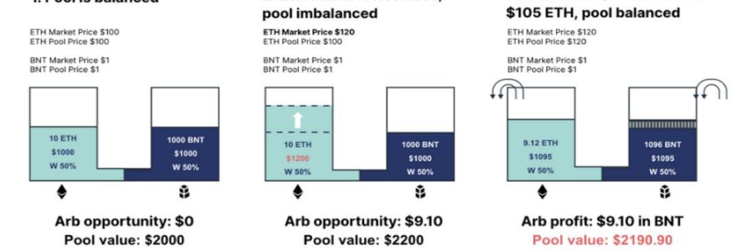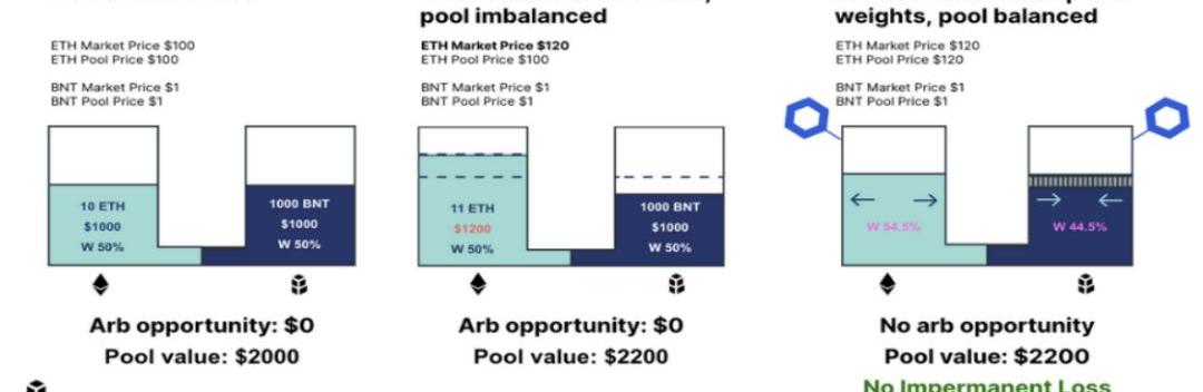 Bancor使用Chainlink预言机,而不是依赖套利来平衡AMM价格与市场价格。池中每一项资产的权重将根据预言机的最新价格进行调整,同时消除套利机会,保护流动性提供者的资产价值。