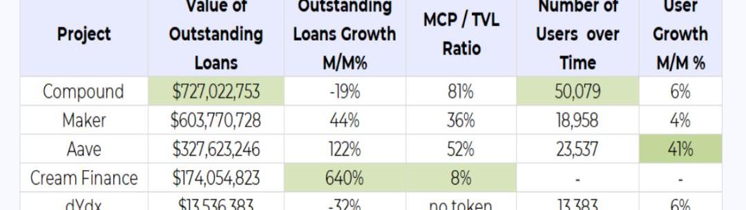 在过去的一个月中,Aave的用户规模增长最快,借贷量增长也十分强劲。Aave总借款中超过65%来自稳定币。值得注意的是,位列第四的?CreamFinance?在过去一个月的借贷量增长率高达?640%。