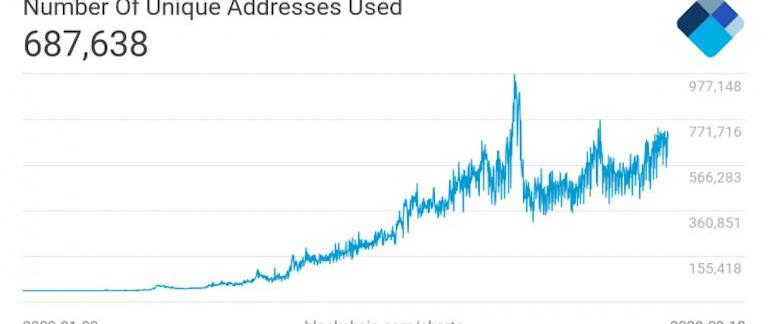 区块链的数据显示,比特币区块链网络的独立地址数量在68.7万个左右。