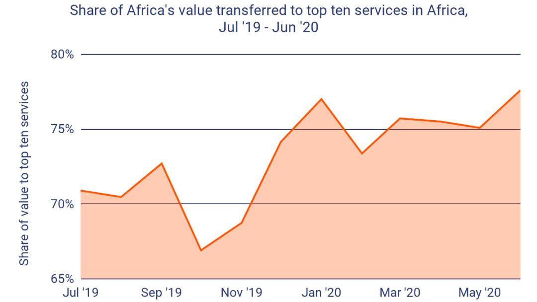 在过去的一年里,在该地区按数量排名的十大服务上,非洲的链上加密货币活动进一步增加,这些服务在该地区整体活动中的份额从2019年10月的66%上升到今天的78%。