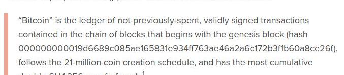“比特币”是一个交易分类账,以区块链的形式记载带有合法签名、花费此前未花费资金的交易。这条链由创世块开始,其哈希为000000000019d6689c085ae165831e934ff763ae46a2a6c172b3f1b60a8ce26f,它按照预定的时间表、在积累了最多double-SHA256工作量证明的链上发行2100万枚比特币。
