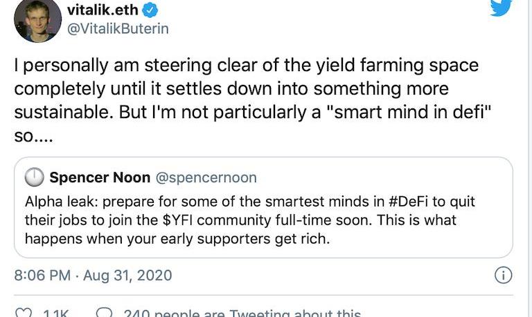 在本月早些时候,Buterin曾警告投资者不要参与yieldfarming: