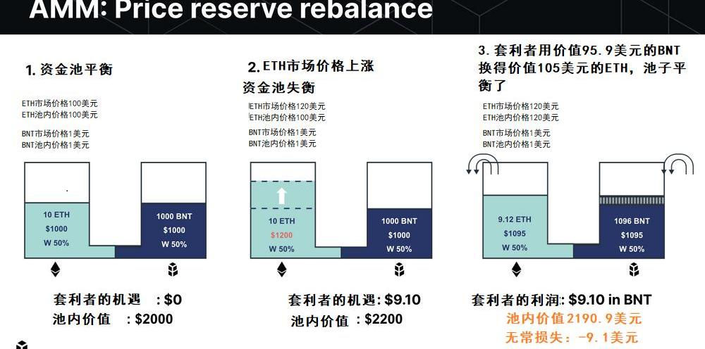 在上面的图示中,由于其他交易所的交易活动导致了ETH的市场价格发生变化,AMM资金池中产生无常损失。而对于这种外部价格变化,AMM的内部反应是:重新调整池中的兑换率以匹配外部市场的兑换率。在这个重新调整(即将池中的ETH换成BNT)的过程中,AMM池中的总储备金略有下降。