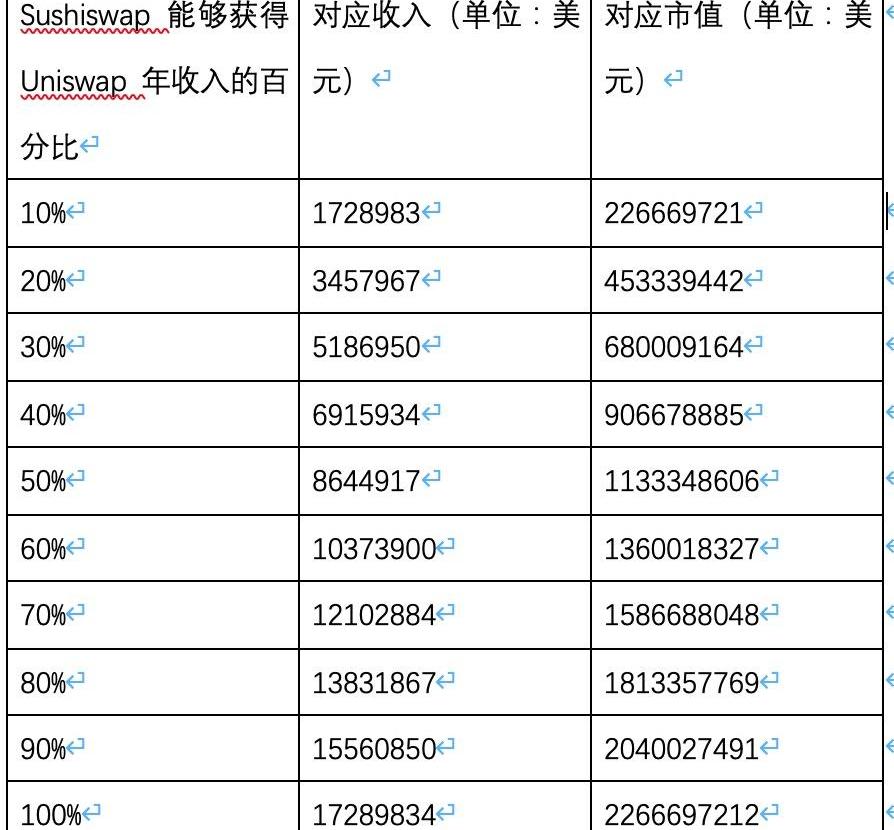 Sushiswap能够获得Uniswap年收入的百分比对应收入对应市值