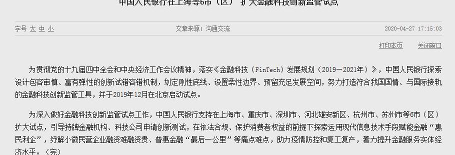 4月27日,中国人民银行表示,为深入做好金融科技创新监管试点工作,支持在上海市、重庆市、深圳市、河北雄安新区、杭州市、苏州市等6地扩大金融科技创新监管试点,引导持牌金融机构、科技公司申请创新测试,着力提升金融服务实体经济水平。