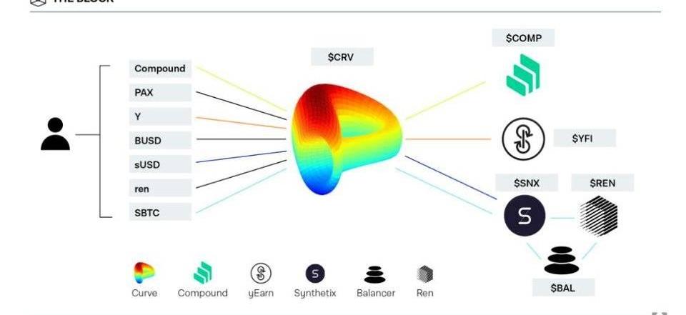 由于其可观的稳定币池,Curve成为许多希望引导稳定币和比特币流动性的人的首选平台。这为Curve的少数池子创造了复利效应,理论上,它可以奖励其流动性提供者多达四个代币。CRV,SNX,REN,和BAL.YFI和COMP的推出也将允许yPool和复合池提供者同时赚取未发布的CRV代币和相应的原生代币。