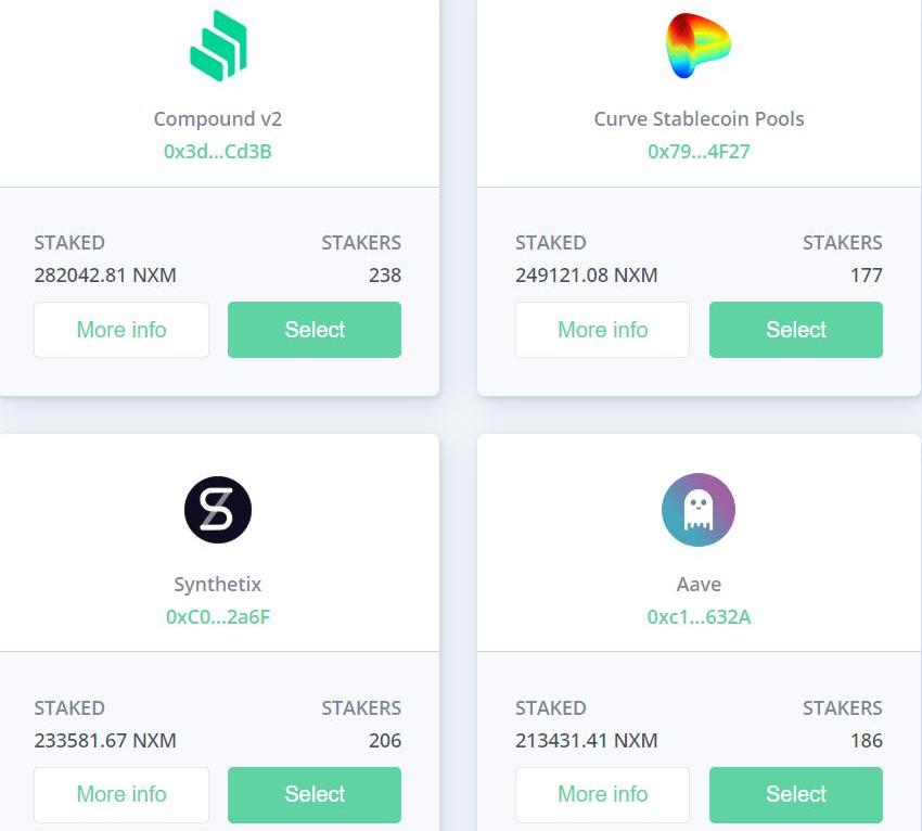 你可以在Staking页面找到所有支持投保的项目,StakingNXM少的项目能够投保的额度非常小,甚至只有个位数ETH。