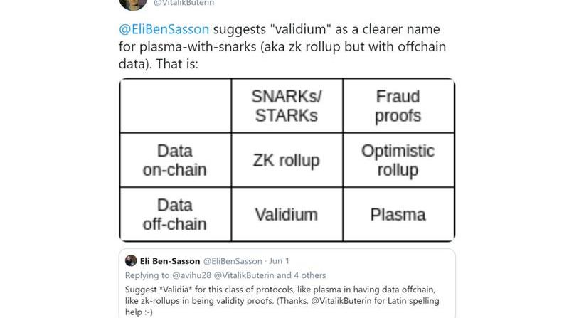 还有其他Ethereum的缩放解决方案,在技术上不符合Plasma/Rollup分类。其中一个例子是Starkware,它实现了交易数据在链外的扩容方案,类似于Plasma。然而,链外交易也是使用一种不需要可信设置的零知识证明形式进行捆绑,称为STARKs。Starkware和Vitalik将这种方式称为Validium。