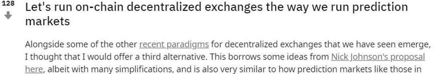 万事开头难,在迈出第一步之后,为了锻炼自己,HaydenAdams决定做一个”真正的”项目练练手。与此同时,V神在reddit上的一篇帖子《Let’srunon-chaindecentralizedexchangesthewaywerunpredictionmarkets》中正好提到了一种全新的DEX机制设想。