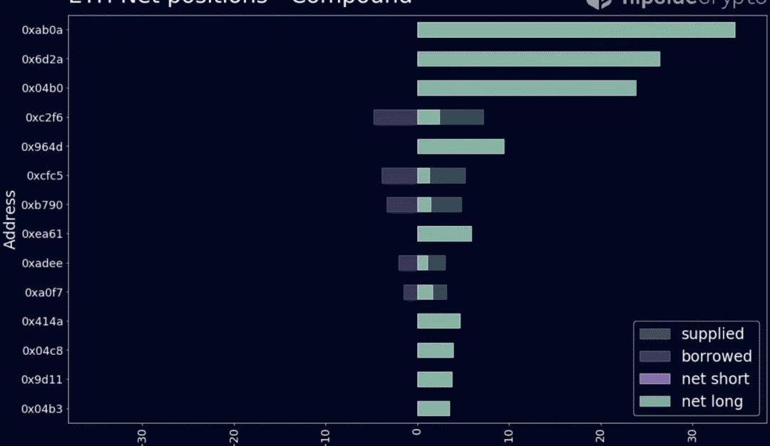供给给Compound的大部分ETH被用作复用DAI头寸的抵押品。许多拥有大量DAI头寸的地址也出现在这里。