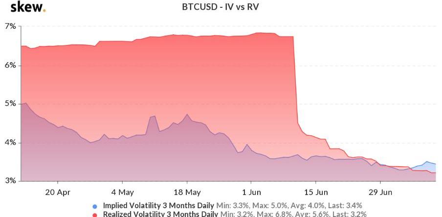 尽管6月份过去的记录更令人振奋,但链上数据、现货和衍生品交易量等数据指标正触及低点。已实现波动率在6月中旬再次大幅跳水,并在接近6月底时跌破市场预期,市场预期也呈现下降趋势。随着突破10,000美元的信号失效,期货市场表现出疲态。自4月以来,日均交易量也一直呈显著下降趋势。