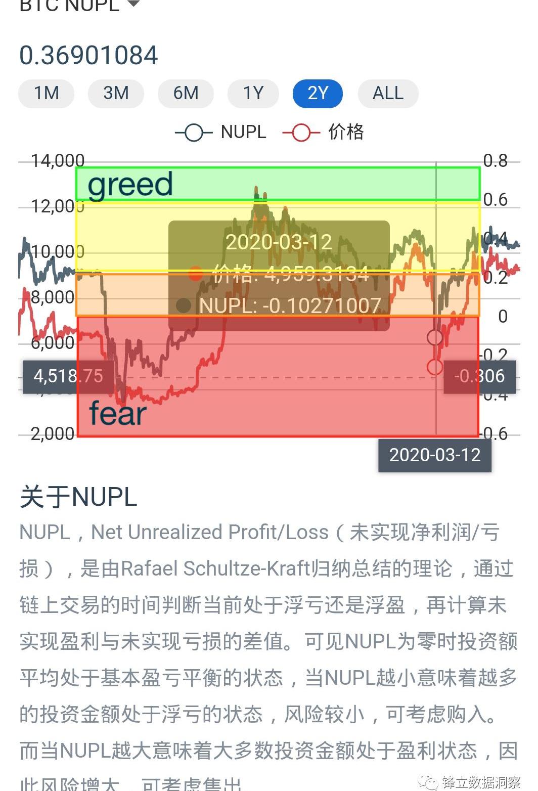 同样可以看出NUPL很好的展示今年312行情市场处于极度恐慌,投资人已彻底放弃,而市场很快就做出了修正,钟摆重新向价值中心移动。而2018年末至2019年初同样市场处于NUPL红色区域,现在回头看来3000多至4000多美元的比特币价格绝对值得购买。尽管市场并没有向312行情一样重复,市场花了3个多月才走出极度恐惧的状况。