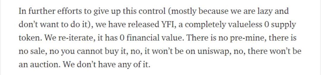 交出了整个yearn.finance工具套件的控制/治理权。尽管他有权力给自己一个矿前或创始人的奖励,但他却选择为自己不预留任何代币。