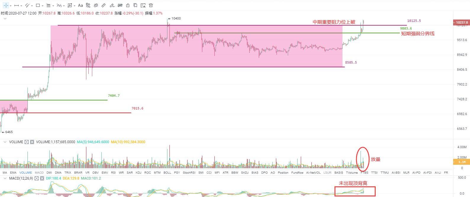对于本轮上涨行情的主要推动因素我认为有以下几点:1、最具代表性的避险资产-黄金一路扶摇直上,不断刷新年内高点,并于今天刷新历史新高,上破2011年9月份大牛市高点。而比特币一直被相当一部分投资者赋予“数字黄金”的美名,金价的不断上涨必然会带动具一批有数字黄金信仰的投资者买入。2、以美联储为代表的央行大“放水”已成事实,而放水最直接的影响便是推升资产价格,数字资产当然也不例外。3、在技术层面,币价于2017年牛市高点向下延伸一条长周期压力线曾经对价格产生多次强烈压制,包括自5月初以来所展开的近三个月的盘整也正是受到了这条压力线的压制。以往在受到压制后很快便折返向下,而这次并没有,而是展开长时间盘整来消化向下的力量,反向推理,这也是一种强势表现。我们在过往的文章中也曾多次提到一个价位-8500,说它是中线行情的强弱分界线,只要不破该价位,中期走势都属于偏多头格局。