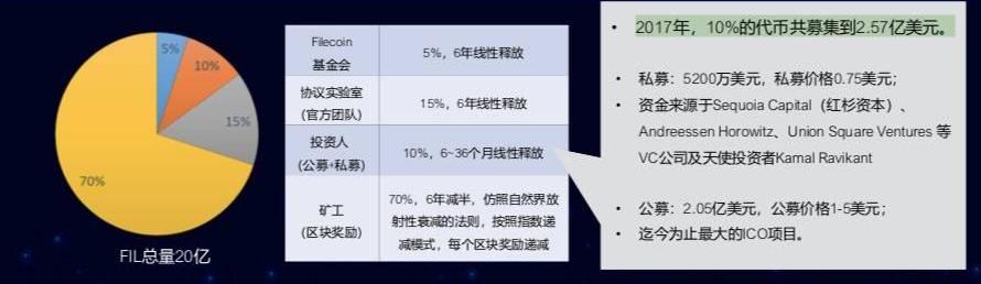 FIL总量20亿,基金会持有5%,分6年线性释放。团队持有15%,同样是6年线性释放。2017年将10%代币进行融资,筹集了2.57亿美元。其中私募筹集5200万美元,私募价格0.75美元,参投机构包括红杉、AndreessenHorowitz、UnionSquareVentures等VC公司及天使投资者;公募2.05亿美元,公募价格1-5美元,Filecoin也是迄今为止最大的ICO项目。剩下70%都是矿工的,仿照自然界放射性衰减的法则,按照指数递减模式,每个区块奖励递减。