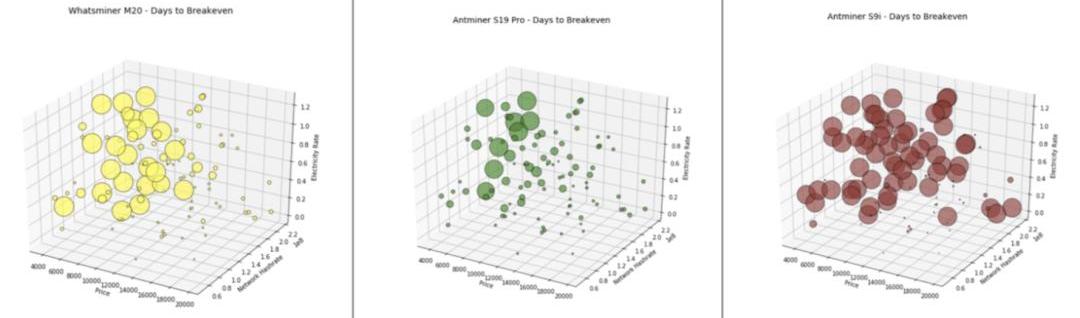 这是一种静态计算,没有捕获矿机随基础变量变化而变化的期权价值。该指标有两个组成:收入和成本。在投资挖矿之前,大多数矿工了解其成本结构。而在矿机的使用寿命内单位成本是固定的。而收入,则由三个随机漫步的变量决定: