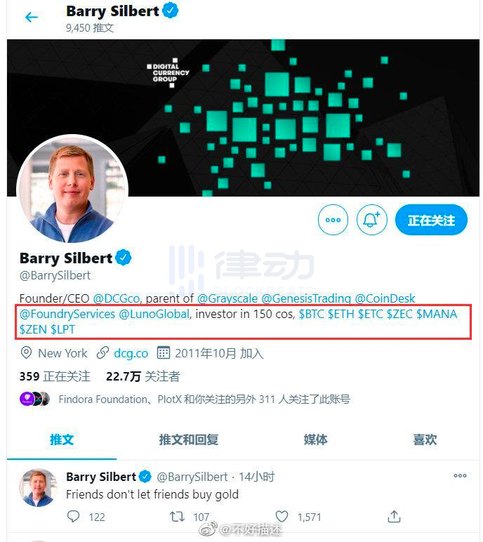 而根据微博 KOL「不好描述」在微博上提供的截图显示,灰度创始人 Barry Silbert 此前的推特简介中,也提到了 MANA、LPT 等代币的持仓。