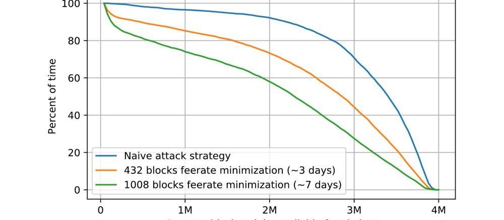 除了设置初始通道feerate之外,通道的发起人还可以在通道开放后的任何时间提出新的feerate,以将其调整为当前的区块链费用状态。闪电协议指出,在我们的情况下,另一方不允许提出任何feerate的更新请求。在“feerate-minimization”策略中,攻击者在可能的情况下)使用费用更新机制降低通道的feerate,但从在区块链费用高时进行更新。一旦通道的费用率与实际的区块链费用率之间的差异变得很大,攻击者就可以开始启动所有HTLC付款并发起攻击。在下图中,我们看到了当攻击者持续3天和7天使用feerate-minimization策略时,受害者可用的平均区块空间。例如,当攻击者试图在开始攻击前7天将费用降到最低时,受害人只有58%的时间可以使用平均一半的区块空间,或者更多