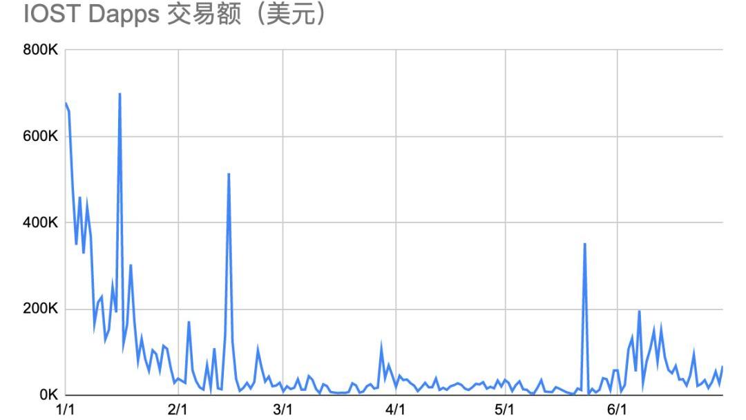 IOST是一个基于“置信度证明”(PoB)的高性能区块链。2020年第二季度,IOST共有活跃Dapp36个,其中游戏类XPET和抽奖类iPirates是最流行的Dapps。IOSTDapp总交易额为351万美元,环比下降65.03%。