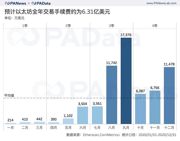 按照每日每笔交易的平均手续费和每日交易的笔数可以估算以太坊的每日交易手续费总额。根据预计,2020年以太坊全年交易手续费约为6.31亿美元,其中9月、8月和12月的手续费总额分别达到了约1.74亿美元、1.17亿美元和1.15亿美元。