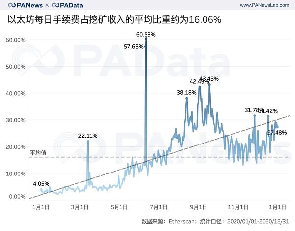 2020年以太坊每日手续费平均占每日总收入的16.06%,较同期比特币的手续费占比高出近10个百分点。