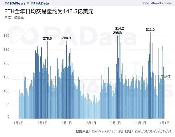 根据统计,ETH全年日均交易量约为142.5亿美元,其中,9月10日创下了年内最高单日交易量,约为314.2亿美元,7月3日创下了年内最低交易量,约为51.09亿美元。另外,全年单日交易量超过200亿美元的天数有54天。