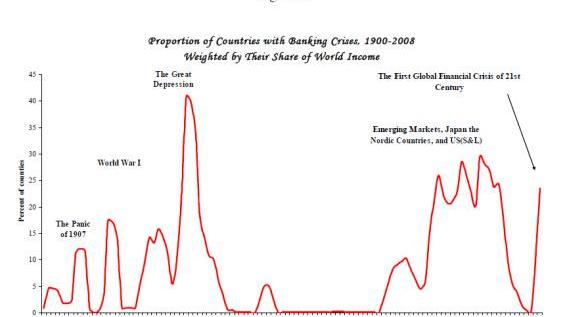 下图显示了1900年至2008年之间处于金融危机状态的国家数量的百分比: