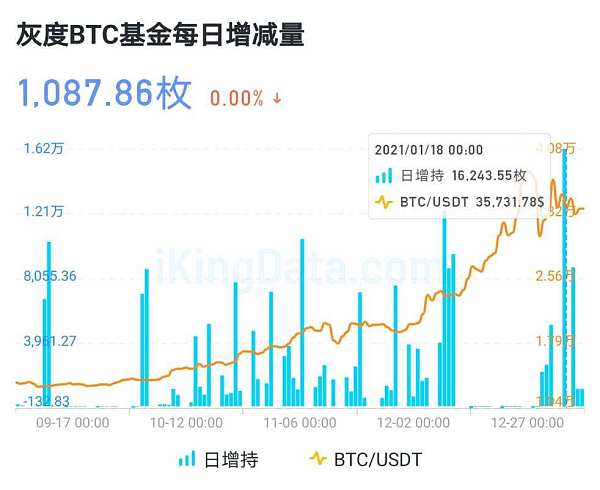 从“灰度BTC基金累计持仓”和“灰度BTC每日增减量”的图表中我们可以出BTC价格与灰度增持间明显的正相关性,灰度增持的BTC越多,比特币的价格越高。当然增持比特币的基金、机构不仅仅只有灰度一家。