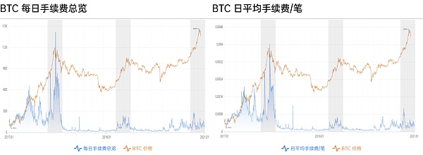 从“每日手续费”和“日平均手续费/笔”历史趋势图中可以明显看到,17年BTC牛市末端,链上交易活跃异常高,19年BTC小牛市末端时也出现了类似现象。而在当前BTC在创下历史新高背景下,这两组数据未能同步创下新高,且与19年数据接近。虽说17年的散户牛市结构和现在的机构牛市结构不同,但若为牛市末端,市场情绪催生出的数据变化理应超越19年,并形成17年末短的异样增长现象。