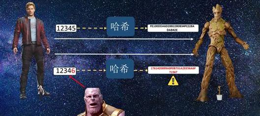 假设星爵想将“12345”这串数字传给格鲁特,又担心被灭霸中途截获,篡改信息。他可以算出这串数字哈希值:FE100DDA6D28B2280B34FC228ADAB42E,然后将这串数字和他的哈希值同时传给格鲁特。格鲁特在得到这串数字后同样进行哈希运算,看看得到的哈希值跟星爵告诉他的是否一致。如果一致,说明格鲁特和星爵拥有的原数字是一样的,这串数字在传输过程中没有遭到篡改或发生损坏。如果灭霸悄悄干预了数字传输过程,把原数字串改成了“12346”,再把错误数字传给格鲁特,格鲁特算出的哈希值就会是:1761420899A8F0B731A2EE56A6F71567,与星爵给他的截然不同,自然就会发现数据被篡改了。
