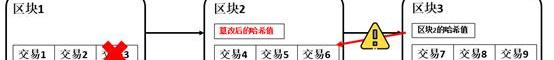 如果删除掉第一个区块中的交易3,那第2个区块中的哈希值就会发生变化,证明第1个区块中的交易信息被篡改了。