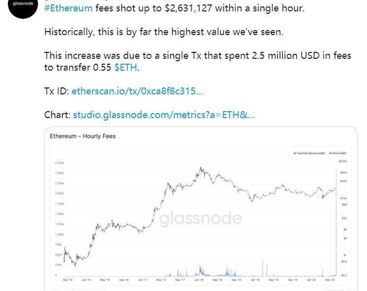 “以太坊的交易费在一个小时内飙升至2,631,127美元。从历史上看,这是我们所见过的最高值。这一增长是由于一笔交易花费了250多万美元的费用转移了0.55ETH。”