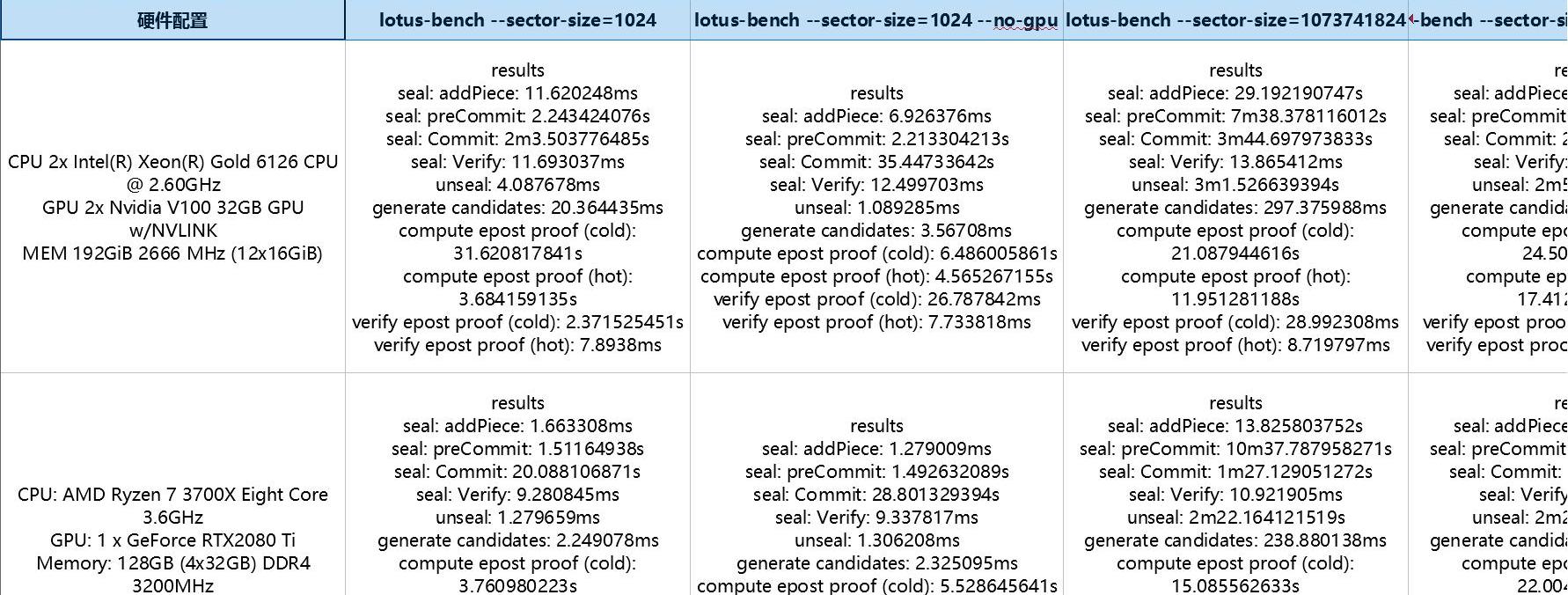 下图是包括filcloud团队在内的全球技术团队对不同CPU/GPU测试的数据截图,大家如果要完整资料可以在文后留邮箱获取。
