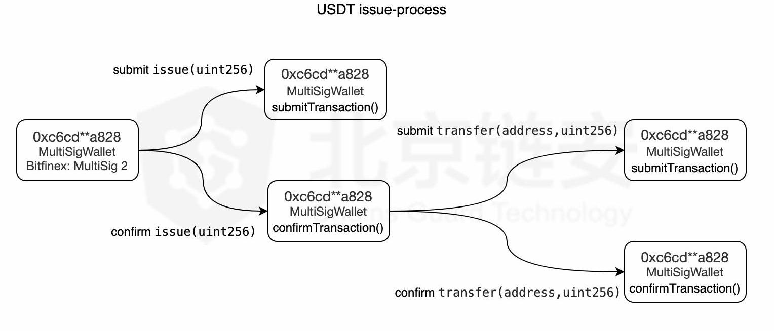 可以看到,USDT的增发需要通过MultiSigWallet跨合约调用才能完成。而MultiSigWallet智能合约存在多个owner用户,完成一次跨合约调用需要至少3个owner的确认。这种增发机制在一定程度上杜绝了当某一owner账户丢失或被盗时USDT被恶意增发的安全隐患。