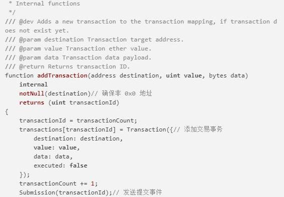 submitTransaction(address,uint,bytes)?会调用到合约内部的addTransaction(address,uint,bytes)?函数,其实现如下: