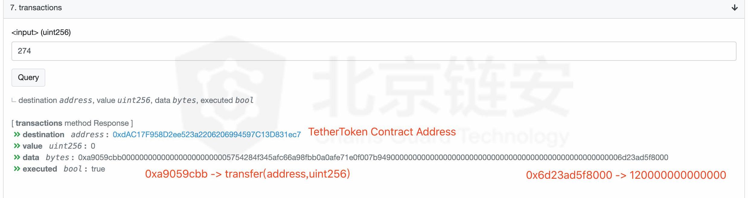 可以看到在上图交易详情中并没有调用TetherToken合约的issue(uint)?增发函数,而是调用了MultiSigWallet合约的confirmTransaction(uint)?函数完成的增发操作。