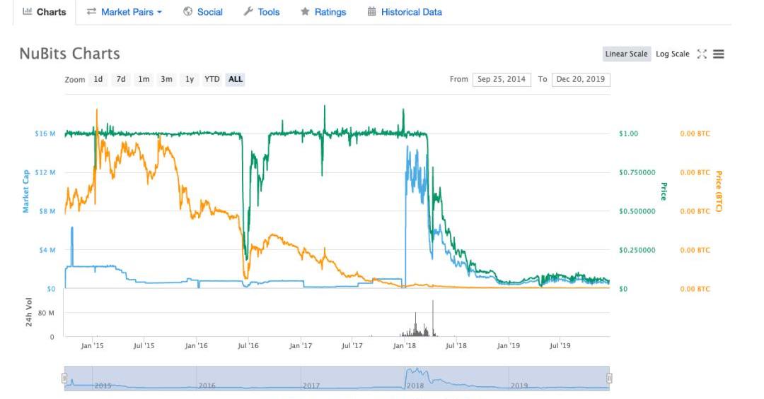 事实证明,这些稳定币不如其他类型的稳定币受欢迎的一个原因可能是,它们在实现稳定方面并不是特别有效。例如,NuBits,它是一种由DAO治理的非抵押的稳定币,在其美元挂钩的汇率数次断裂后,失败了。缺乏储备意味着没有任何东西可以对冲需求的突然下降。
