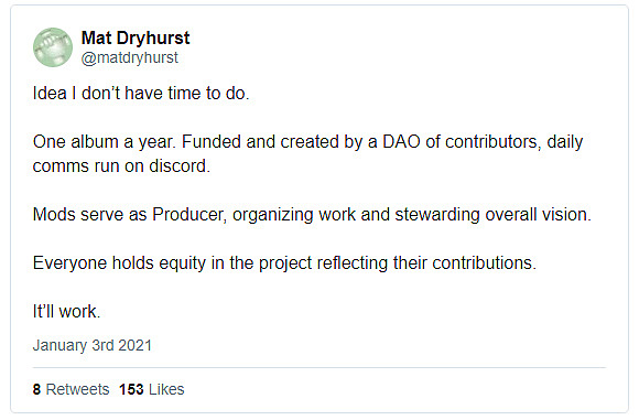 与流动性挖矿用于引导def项目的资本类似,社区很有可能联合起来为专辑筹措营运资本。这个问题从一个艺术家应该发行多少作品开始,然后迅速转向对该作品的收入中,共同产权比例应该是多少的思考。