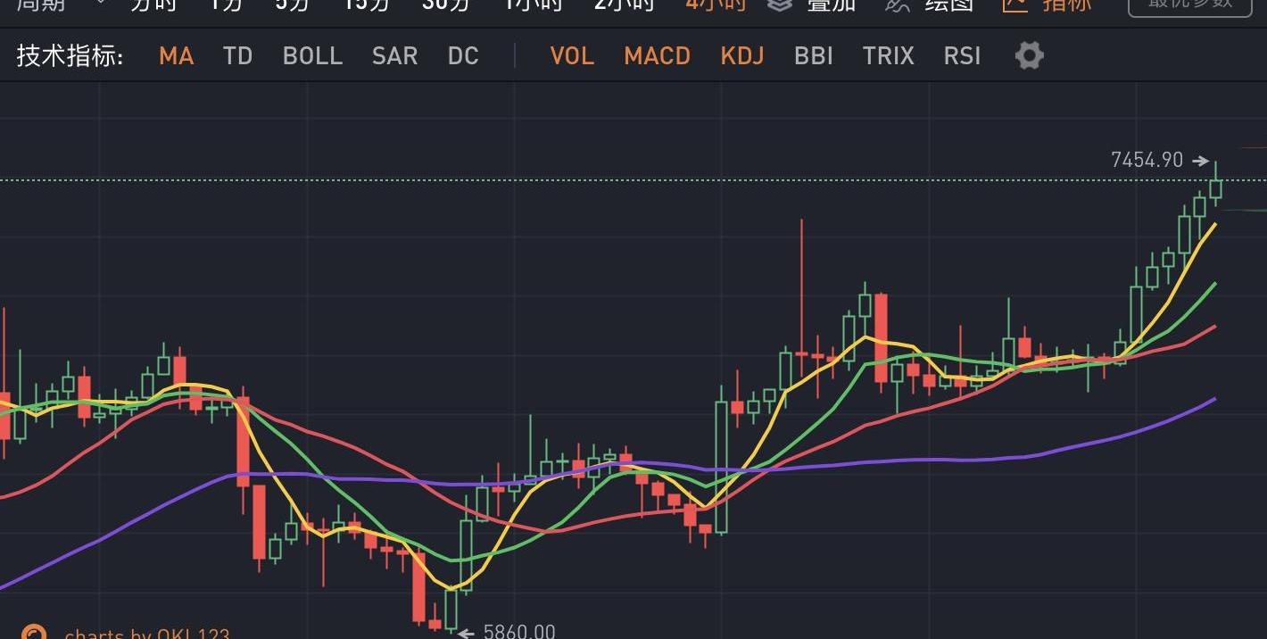 由于全球各国刺激措施不断,本周一,黄金价格同样大涨,COMEX黄金期货6月合约盘中一度触及七年高位1715.8美元/盎司,最终收报1693.9美元/盎司,涨幅2.93%。“数字黄金”比特币也大幅走高。QKL123行情显示,比特币日内大涨8.41%,暂报7409美元,创下3月12日以来高点,目前已收复“312大跌”以来大部分跌幅。宏观市场的利好也被认为是此次大涨的重要因素。