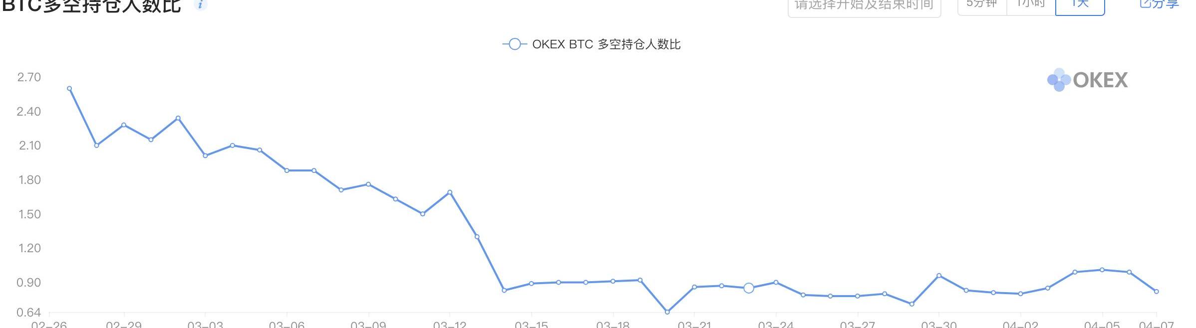 事实上,自3月的“减半性”大跌以来,比特币市场上做空情绪一直占据主导位置。OKEx数据显示,BTC多空持仓人数比自3月13日以来,绝大多数时间都处于1以下的位置,3月20日更是低至0.64。同样的,BTC精英多空平均持仓比例,也一直是空头占优。