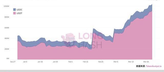 投资者抛售比特币并买入稳定币意味着什么?至少从短期来说,这不是看涨的信号。截至3月3日,交易所上USDT和USDC内的资金还只有4亿美元。在不到四个星期的时间内,总余额迅速增加了150%。