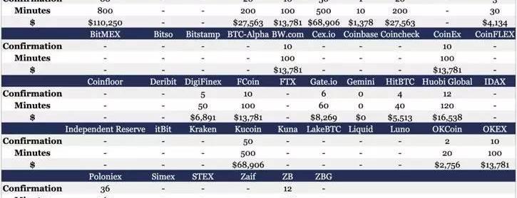 ?有两家交易所的充值方式最为保守,分别是IndependentReserve和Liquid。这两家交易所需要50个确认数,也就是说用户充值到账大约需要等待11分钟,而黑客逆转交易大约需要11000美元。