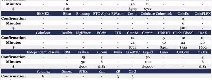 此外将各交易所的区块确认所需时间进行了比较。虽然比特币网络与其他资产相比安全性是最高的,但从充值等待时间来看,交易所为用户造成的成本有时会过高。