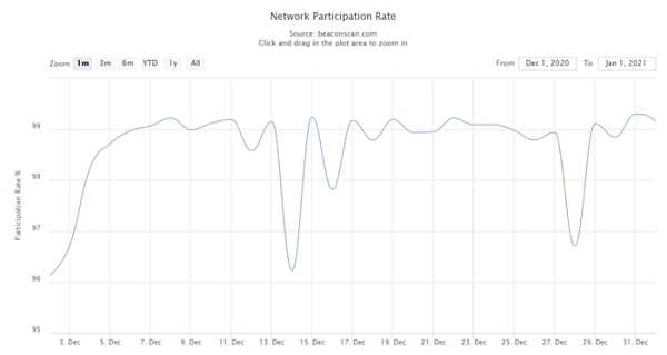 这些验证人有多少是真正在进行验证的?由于测试网络 Medalla 上的 ETH 是不值钱的,所以 Eth2 的参与率很低。社区成员坚定地认为,主网不会面临同样的难题。事实证明,他们是对的,自信标链在主网上线以来,参与率高达 96% 以上。