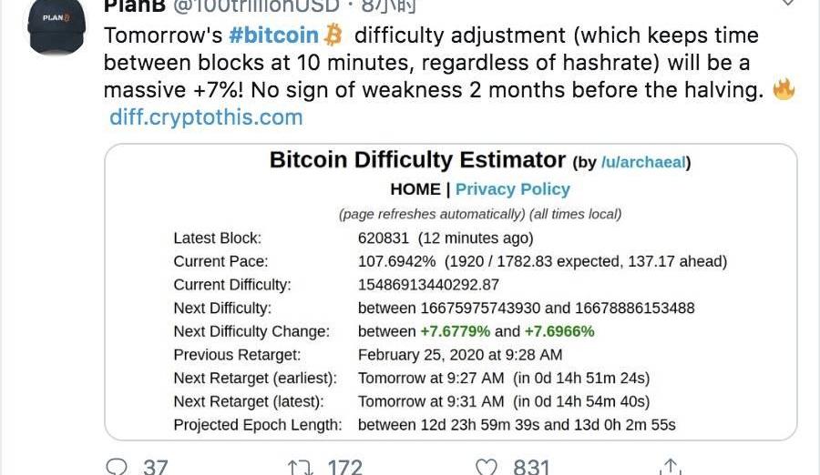 随后,他还补充表示,明天的比特币难度调整将是巨大的7%!其认为减半前2个月并没有出现疲软迹象。