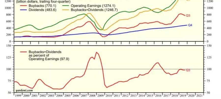 近些年,美股二级市场股票回购创历史新高。天风证券研究所近期发布的报告中提到,2018年,美国上市公司股票回购达到1.085万亿美元,占GDP的接近3%,占营运利润的125%,皆创历史新高。1982年前后,美国上市公司仅将其利润的4%用于回购,而在2011-2018年七年间,这个数据增长到平均为53.7%。