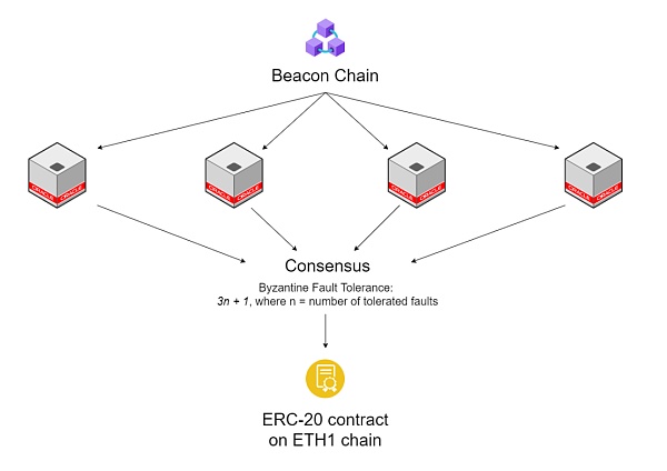 链下预言机以这样的方式允许与信标链通信:首先,一个预言机操作符必须同时运行 ETH1 和 ETH2 节点,以实现同时与两条链通信。一旦两个节点都启动了,预言机将从信标链中收集属于某个特定质押池的验证者的信息,并传输至 ETH1 链的 ERC-20 合约中。一旦信标链的信息提交至 ERC-20 合约中,代币数量 (或者铸造新代币的汇率) 就会根据验证者余额的变化而更新。这种变化可正增长 (如,获得质押奖励),也可以负增长 (如,产生惩罚)。